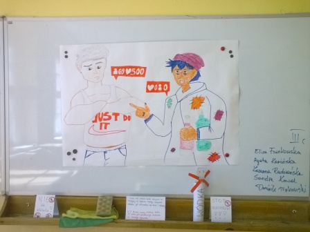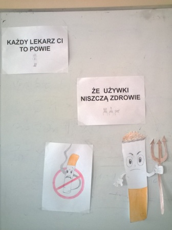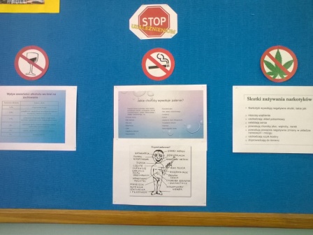 Uczniowie przygotowali gazetki (jedna klasa wystawkę) dotyczące np. szkodliwości i skutków (np. zdrowotnych) palenia papierosów, picia alkoholu, zażywania narkotyków czy tzw. dopalaczy.