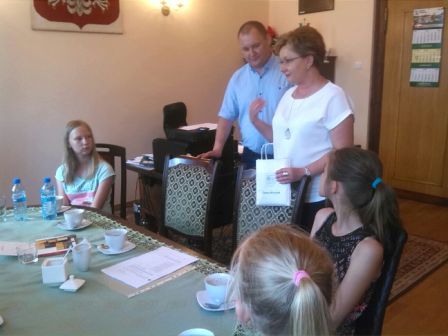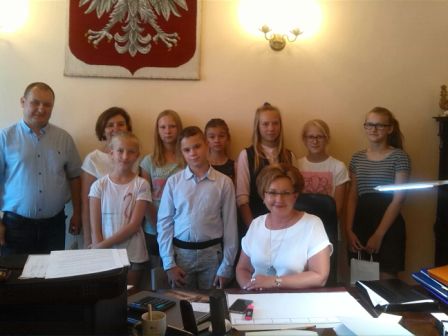11 czerwca grupa dzieci biorąca udział w projekcie edukacyjnym udała się z wizytą do Urzędu Miasta i Gminy Wyrzysk. Dzięki życzliwości firmy przewozowej p.Mirosława Poloczka szczęśliwie dojechaliśmy do Wyrzyska . Przed Budynkiem Urzędu czekał na nas Pan Leszek Matuszewski , wiceprzewodniczący Rady Miejskiej, który towarzyszył nam w czasie całego pobytu w urzędzie. Odwiedziliśmy Jego biuro, a następnie zostaliśmy zaproszeni do gabinetu Pani Burmistrz Bogusławy Jagodzińskiej. Pani Burmistrz przyjęła nas bardzo życzliwie. Oprowadziła po urzędzie. Byliśmy między innymi u pani sekretarz, głównej księgowej, pani skarbnik, w biurze ewidencji ludności oraz urzędzie stanu cywilnego. We wszystkich referatach pani Burmistrz wyjaśniała czym zajmują się pracownicy danych działów. Następnie przy herbatce w gabinecie uczniowie rozmawiali na temat pracy pani burmistrz , jej zadaniach i problemach.