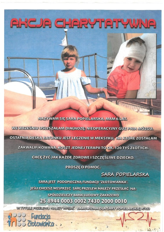 Na terenie gminy Wyrzysk odbywa się akcja zbierania funduszy na leczenie Sary Popielarskiej, 6 - letniej dziewczynki z Nieżychowa, która choruje na guza mózgu. Organizatorem tych działań jest fundacja „Złotowianka”. Nasza szkoła również bierze udział w tej akcji. Członkowie Szkolnego Koła Wolontariatu będą zbierać datki na leczenie Sary po mszach świętych w niedzielę trzeciego marca przed kościołem parafialnym w Osieku nad Notecią. Prosimy wszystkich o włączenie się do naszej akcji. Pamiętajmy, że każda pomoc jest wartościowa, a pomaganie zmienia świat na lepsze.