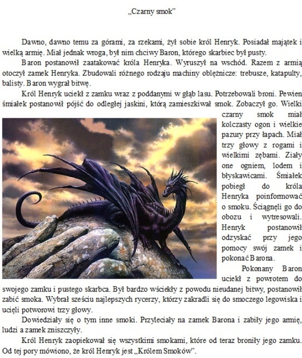 Pragnę ogłosić, że w tym miesiącu, w kategorii klas młodszych, zwycięzcą konkursu literackiego „Tworzę, więc jestem”, został debiutant, uczeń klasy czwartej – Mirosław Gajewski, który w swoim opowiadaniu uraczył nas wspaniałą opowieścią o tajemniczym czarnym smoku i królu Henryku. Historią tą przeniósł nas w świat baśniowych wydarzeń. Jeśli jesteście ciekawi, jak potoczyły się losy głównych bohaterów, zapraszam do lektury! Mirku, gratuluję! Czekamy na ciąg dalszy Twoich literackich poczynań.