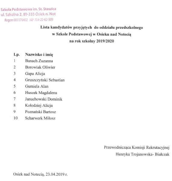 Lista kandydatów przyjętych do oddziału przedszkolnego