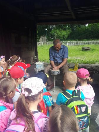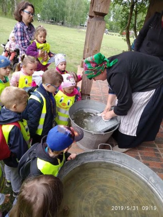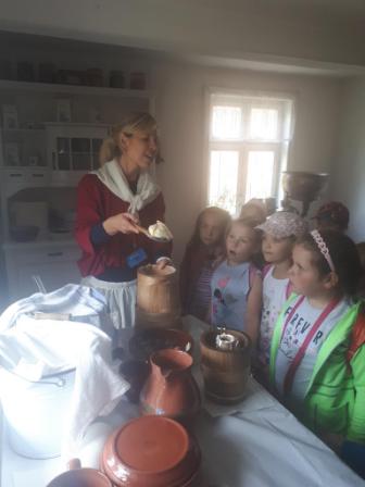 Na miejscu zwiedziliśmy najciekawsze chaty oraz zapoznaliśmy się z codziennymi zajęciami wykonywanymi na dawnej wsi, m.in. praca garncarza, wyplatanie koszyków oraz sieci, tkanie na krosnach i deseczkach tkackich, praca gospodyni. Jedną z większych atrakcji było samodzielne wyrabianie masła. Każde dziecko brało czynny udział w tej mozolnej pracy. Dzieci uczestniczyły również w wytwarzaniu miseczek z gliny, które po własnoręcznym ozdobieniu mogły zabrać do domu. Nie zabrakło również słodyczy i zabawy na świeżym powietrzu. Wszyscy w świetnych nastrojach powrócili do szkoły.