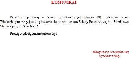 Administratorem danych osobowych w rozumieniu ustawy o ochronie danych osobowych jest: Szkoła Podstawowa im. Stanisława Staszica, 89-333 Osiek nad Notecią, ul. Szkolna 2