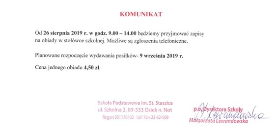 Administratorem danych osobowych w rozumieniu ustawy o ochronie danych osobowych jest: Szkoła Podstawowa im. Stanisława Staszica, 89-333 Osiek nad Notecią, ul. Szkolna 2