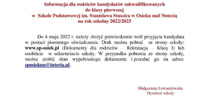 Listy kandydatów zakwalifikowanych i niezakwalifikowanych w postępowaniu rekrutacyjnym do klasy pierwszej w Szkole Podstawowej im. Stanisława Staszica w Osieku nad Notecią