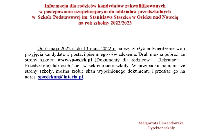 Listy kandydatów zakwalifikowanych i niezakwalifikowanych w postępowaniu rekrutacyjnym uzupełniającym do oddziałów przedszkolnych w Szkole Podstawowej im. Stanisława Staszica w Osieku nad Notecią